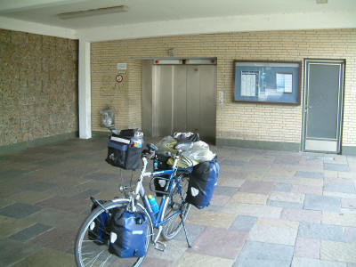 Morgens am 12.08.06 starte ich in Norderstedt, 500m von Zuhause bis zum Bahnhof. Von dort mit der Bahn (AKN) bis nach Neumünster, Fahrradmitnahme war am Sonnabend morgen relativ problemlos, nur das Heben des voll bepackten Drahtesels mit einem Gesamtgewicht von ca. 40 kg über die viel zu hohe Einstiegsstufe in den Zug kostet mal wieder viel Kraft. Aber ich habe ja gut gefrühstückt und jetzt auch eine Stunde Zeit zu verschnaufen.