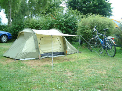 Schnell baue ich mein Zelt auf, denn der Himmel wird bedrohlich dunkel. Kaum bin ich fertig, kommt ein kräftiger Schauer herunter - ich genieße jetzt eine heiße Dusche. Das ist immer das schönste nach einem langen Tag auf dem Rad. Danach futtere ich am Camping-Imbiss noch eine Currywurst mit Pommes, bevor ich mich dann wieder aufs Rad setzte und Schleswig noch einen Besuch abstatte.